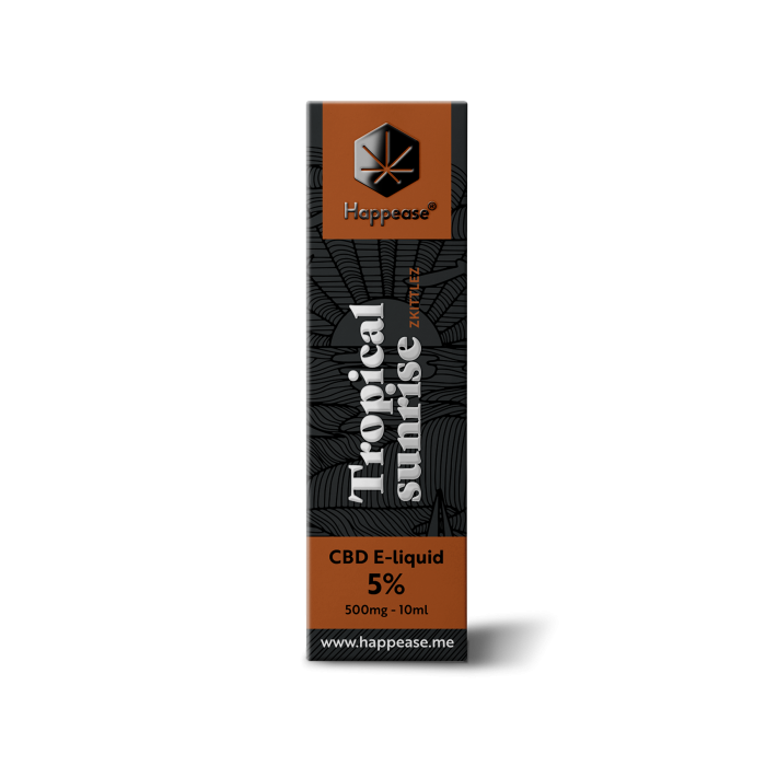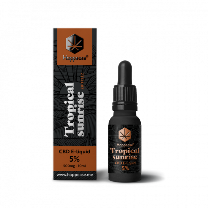 Tropical Sunrise e-liquid para vape al 5% CBD de Happease es un e liquido creado bajo la formulación homónima Tropical Sunrise cuyo perfil de terpenos tiene propiedades que aportan calma y relajación.