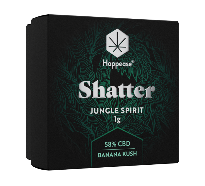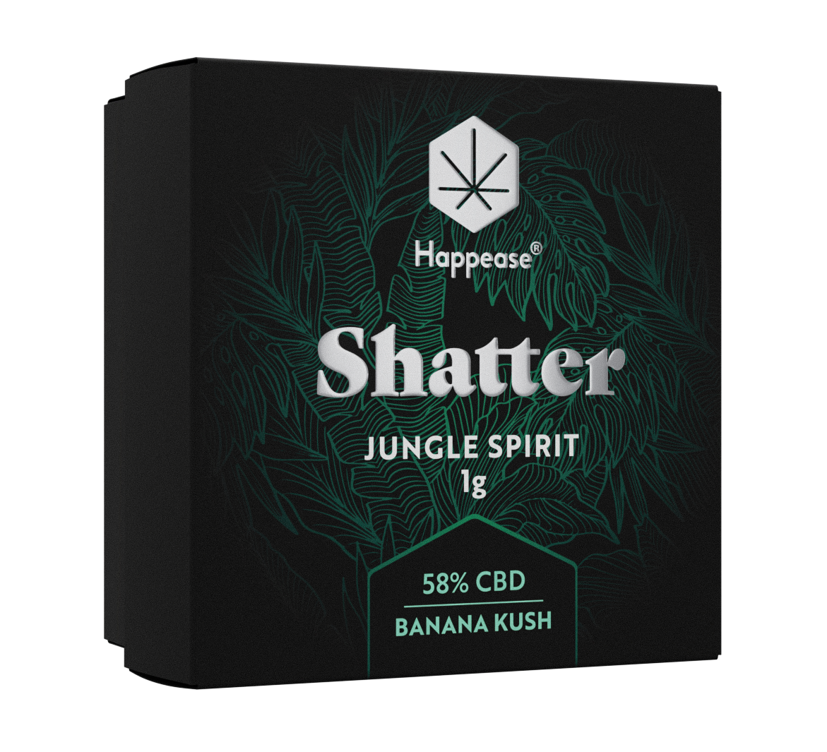 El Happease Shatter  de formulación Jungle spirit es una resina CBD o cristal CBD que se extrae de la planta del cáñamo. El Shatter es un tipo de BHO translucido de color dorado con una textura dura que lo diferencia del resto de extractos viscosos y pegajosos. Su consistencia es muy similar a la del vidrio, de ahí su nombre. Al igual que el resto de los concentrados BHO sus niveles de cannabinoides son muy altos. La extracción de esta resina CBD es un procedimiento bastante complejo. La formulación Jungle spirit  contiene un perfil de terpenos de sabor dulce con efectos energéticos que mejoran la concentración.