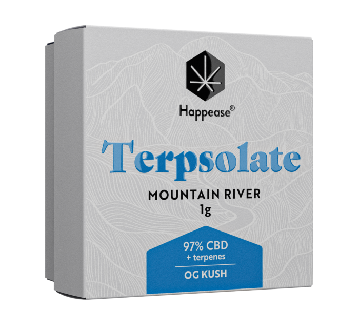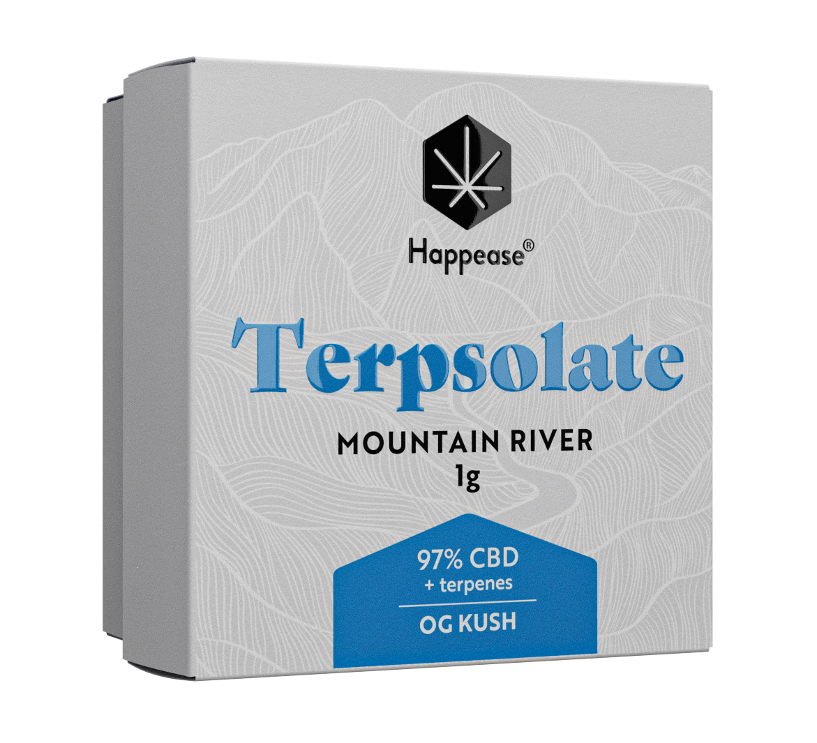 El Happease Terpsolate de formulación Mountain river es una resina CBD o cristal CBD que se extrae de la planta del cáñamo. Se trata de uno de los compuestos de CBD más nuevos en el mercado conteniendo una alta pureza alcanzando un 97% de CBD más terpenos. Tal pureza de da una forma cristalina color ambar. La formulación Mountain river contiene un perfil de terpeno amaderado con una mezcla de OG que crea sensación de calma, siendo perfecto para usar durante la noche ya que ayuda a mejorar el sueño.